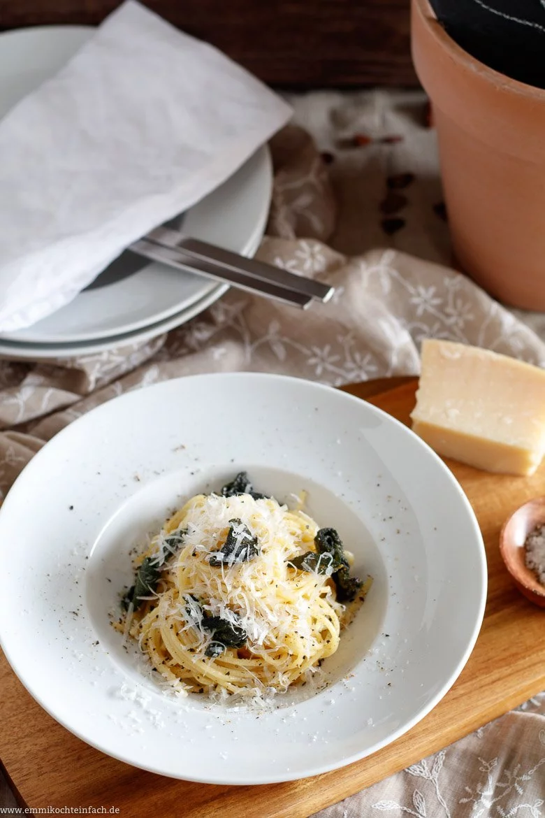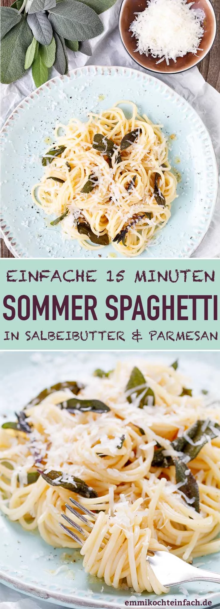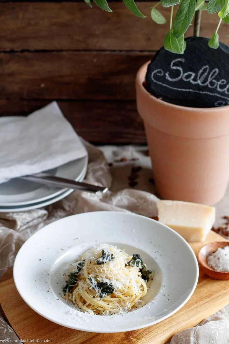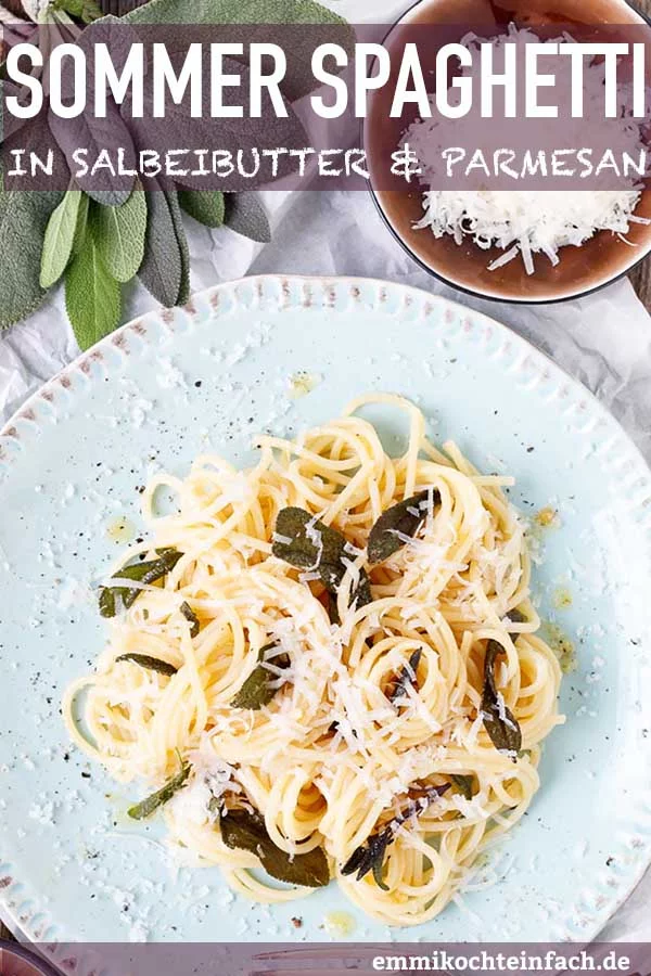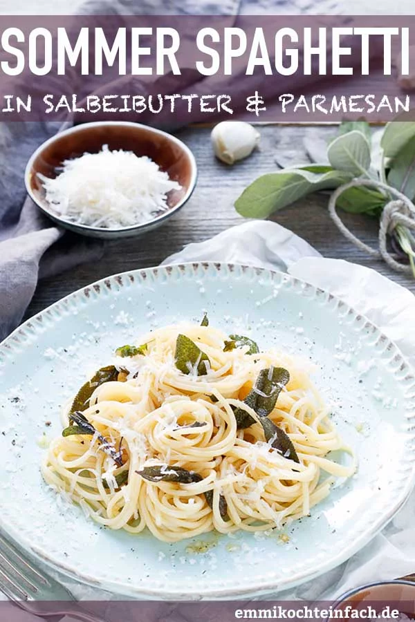 Übrigens eignen sich die Spaghetti in Salbeibutter ganz toll als Vorspeise an einem italienischen Abend. Gerade weil es so einfach und so wahnsinnig schnell geht, denn Du benötigst ja für die Pasta in Salbeibutter lediglich frischen Salbei, Butter, Knoblauch und Parmesan – Finito 🙂