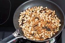 - Das hart gewordene Weißbrot schneidest Du in kleine Stücke zu Brotkrumen. Kann auch etwas krümeliger sein. Dann in einer Pfanne auf mittlerer Stufe 3-4 EL Olivenöl erhitzen (nach Bedarf mehr oder weniger) und die Brotkrumen ca. 5 Minuten bis zur gewünschten Bräune darin rösten. Danach beiseite stellen.