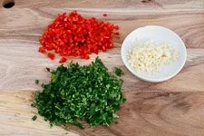 - Jetzt die Blattpetersilie waschen, trockentupfen und sehr fein hacken. Die Chilischoten waschen, den Samen entfernen und ebenfalls fein hacken. Den Knoblauch hackst Du genauso fein.