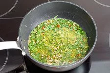 - Die gehackten Chilischoten und die Petersilie einrühren und den Topf vom Herd nehmen. Mit einer Prise Meersalz nach Geschmack würzen.
