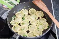 - Jetzt schwenkst Du die Spinat-Ravioli kurz in der Pfanne und nimmst sie von der Herdplatte.