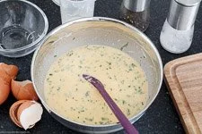- In einer Schüssel schlägst Du mit dem Schneebesen die 6 Eier mit der Sahne auf, vermengst sie im Anschluss mit dem Mozzarella, dem Pecorino und dem Bärlauch (bzw. Schnittlauch) und schmeckst alles gut mit Salz und Pfeffer ab.