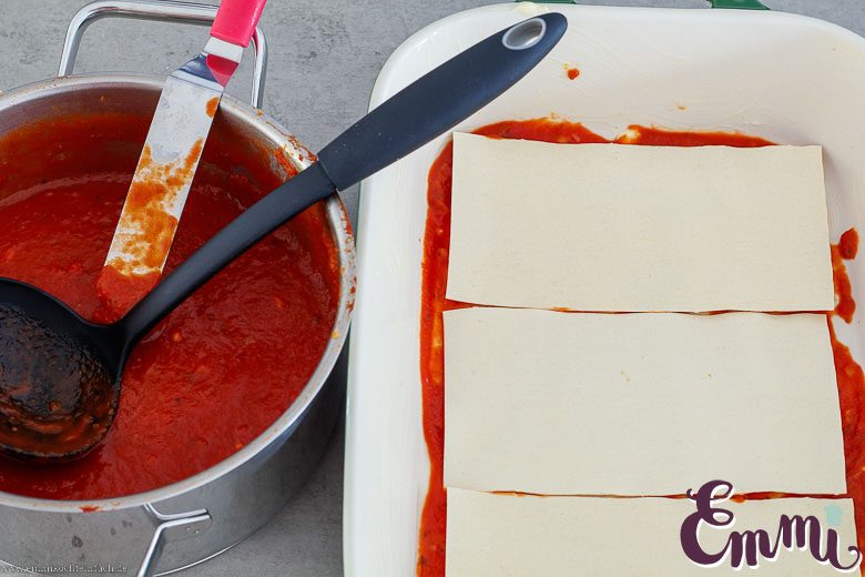 - Das abwechselnde Schichten beider Soßen mit den Lasagneblättern in der Form geht leicht nach meinem Rezept. Tipp: Wenn die Teigplatten nicht passen, kannst du sie passend brechen.