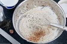 - Jetzt gibst Du den Ricotta zu der Ei-Parmesan-Semmelbrösel-Masse, vermengst alles miteinander und würzt kräftig nach Geschmack mit Salz, Pfeffer und frisch geriebenem Muskat.