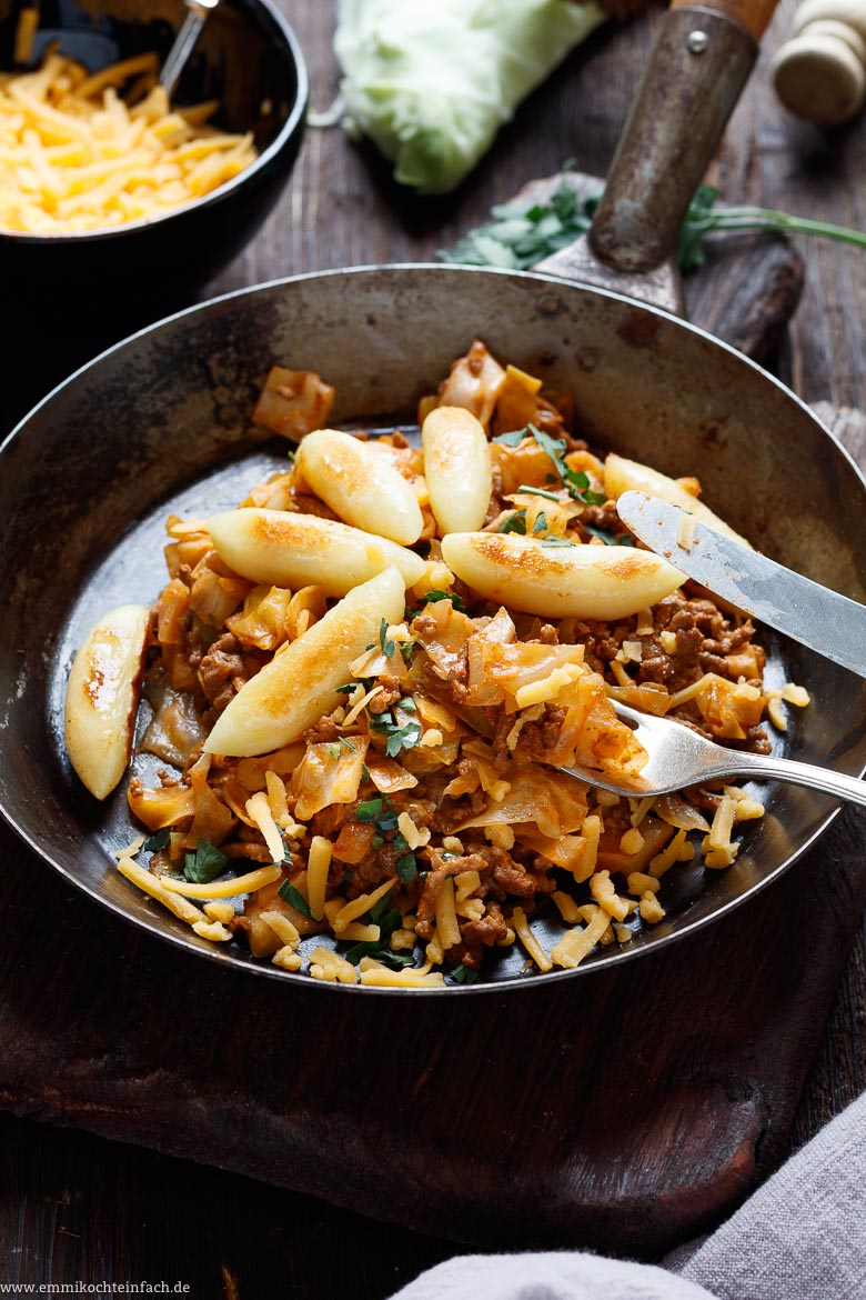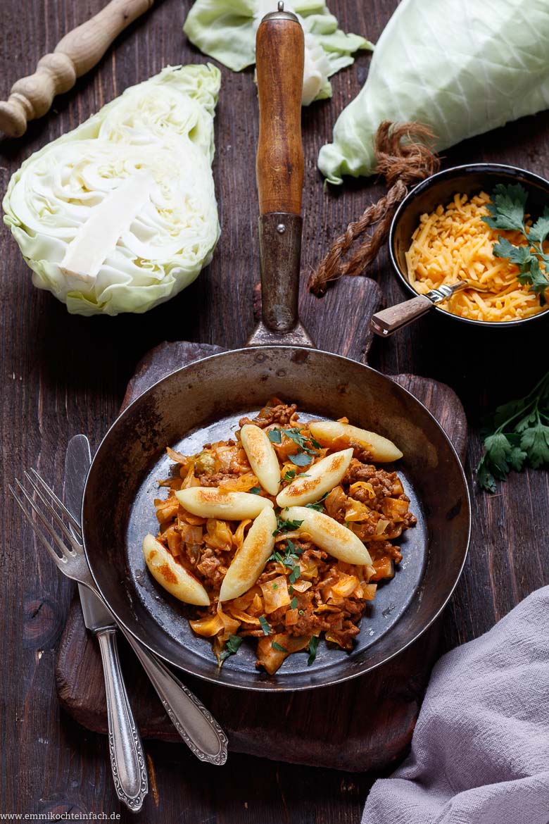 - Zur Spitzkohlpfanne mit Hackfleisch passen zahlreiche Beilagen: (Schupf-)Nudeln, Reis, Kartoffeln oder auch ein knuspriges Baguette oder Brot. Lässt du die Beilagen weg, hast du auch ein ganz einfaches Low-Carb-Gericht.