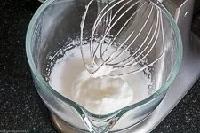 - Für die Schaummasse trennst Du die 2 Eier und schlägst das Eiweiß mit den Quirlen des Handmixers oder der Küchenmaschine steif zu Eischnee.