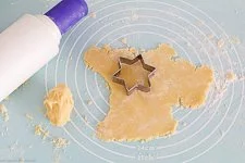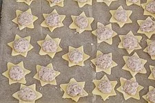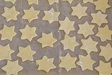 - Die Teigreste vom Ausstechen zusammenschaben, wieder ausrollen und weitere Sterne ausstechen.