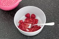 - Als erstes wäscht Du die Himbeeren, gibst sie in eine Schüssel und zerdrückst sie darin mit einer Gabel.