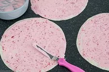 - Als nächstes legst Du die 3 Weizen Tortillas nebeneinander und bestreichst sie ungefähr in gleichen Teilen mit der Himbeercreme bis fast zum Rand oder komplett bis zum Rand.HINWEIS: Wenn Du die Creme bis zum Rand streichst, wird davon beim Aufrollen von ihr etwas herausquellen, allerdings sind dann die Enden etwas besser gefüllt und können knapper abgeschnitten werden. Die Enden ergeben übrigens so oder so kein ganzes, schön anzusehendes Röllchen. Die musst Du so gleich wegnaschen 😉 .