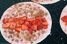 - Wenn Du Dich für Schoko-Cookies entschieden hast nun die Brösel (z.B. in einem verschlossenen Gefrierbeutel mit einem Nudelholz klein gemacht) auf den Tortillas gleichmäßig verteilen und die gewaschenen und in dünne Scheiben geschnittenen Erdbeeren in der Mitte in einer breiten Reihe gleichmäßig auslegen. WICHTIGER HINWEIS: Achte darauf, dass Du eine Ergänzungs-Masse wählst, die die Himbeercreme zusätzlich etwas bindet: Sprich gehackte Mandeln plus gemahlene Mandeln oder weiße, geriebene Schokolade plus Kokosflocken. So besteht später nicht die Gefahr, dass die Himbeercreme beim Verzehr aus Deinen Röllchen leicht rausfließt, denn die Weizen Tortilla saugen kaum etwas auf.