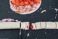 - Jetzt rollst Du die Weizen Tortillas vorsichtig von unten Richtung "Erdbeer-Straße" auf und schneidest sie in ca. 3 cm dicke Scheiben.