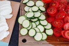 - Jetzt wäschst Du die Zucchini und die Tomaten und schneidest beides in ca. 0,5 cm dicke Scheiben. Den Mozzarella in 0,3 cm bis 0,5 cm dicke Scheiben schneiden und die großen mittigen Scheiben halbieren.HINWEIS: Wenn Du die Zucchini in dieser Stärke schneidest, dann sind sie am Ende der Garzeit noch knackig. Wenn Du das nicht magst, schneide sie dünner so ca. 0,3 cm.