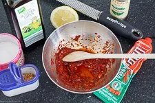 - Für die Marinade rührst Du die 2 EL Olivenöl mit 2 EL Tomatenmark und dem Spritzer Zitrone glatt, gibst den Abrieb der halben Bio-Zitrone und die fein gewürfelte Knoblauchzehe dazu und würzt mit 1 TL Oregano, 1 TL Meersalz und 1 Messerspitze Chiliflocken.