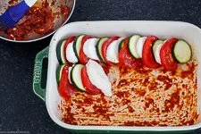 - Mit der ersten Hälfte der Marinade bestreichst Du den Boden Deiner Auflaufform, dann schichtest Du die Zucchini-, Tomaten- und Mozzarella-Scheiben, abwechselnd und weitestgehend aufrecht, in die Auflaufform.