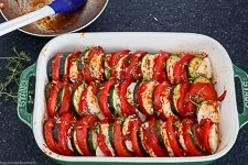 - Wenn Du alles eingeschichtet hast, dann bestreichst Du das Gemüse und den Mozzarella mit der zweiten Hälfte der Marinade. Die gewaschenen und getrockneten Thymianblättchen noch darüber geben und für 25 Minuten auf der mittleren Schiene in den vorgeheizten Backofen geben. HINWEIS: Bei dem Auflauf gibt es sehr viel Soße in Form von Gemüsesaft, deshalb passen Beilagen sehr gut, die viel Soße aufnehmen können, wie zum Beispiel Reis.