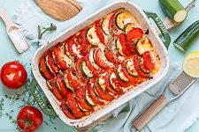 Tomate und Zucchini sind bei uns Deutschen übrigens in der Gemüse-Top 10 zu finden und ich schließe mich der Mehrheit voll und ganz an. Auf unserem Speiseplan sind beide Dauergäste. Und das nicht nur im Sommer. Deshalb habe ich sie mal in einem praktischen Beilagen-Auflauf verarbeitet. Er eignet sich zudem ganz toll als vegetarische Mahlzeit, allerdings reicht die Menge dann nur für zwei Personen. Falls Dir das Rezept gefällt und Du es für vier Vegetarier zubereiten möchtest, müsstest Du die unten angegebene Zutatenmenge einfach verdoppeln.