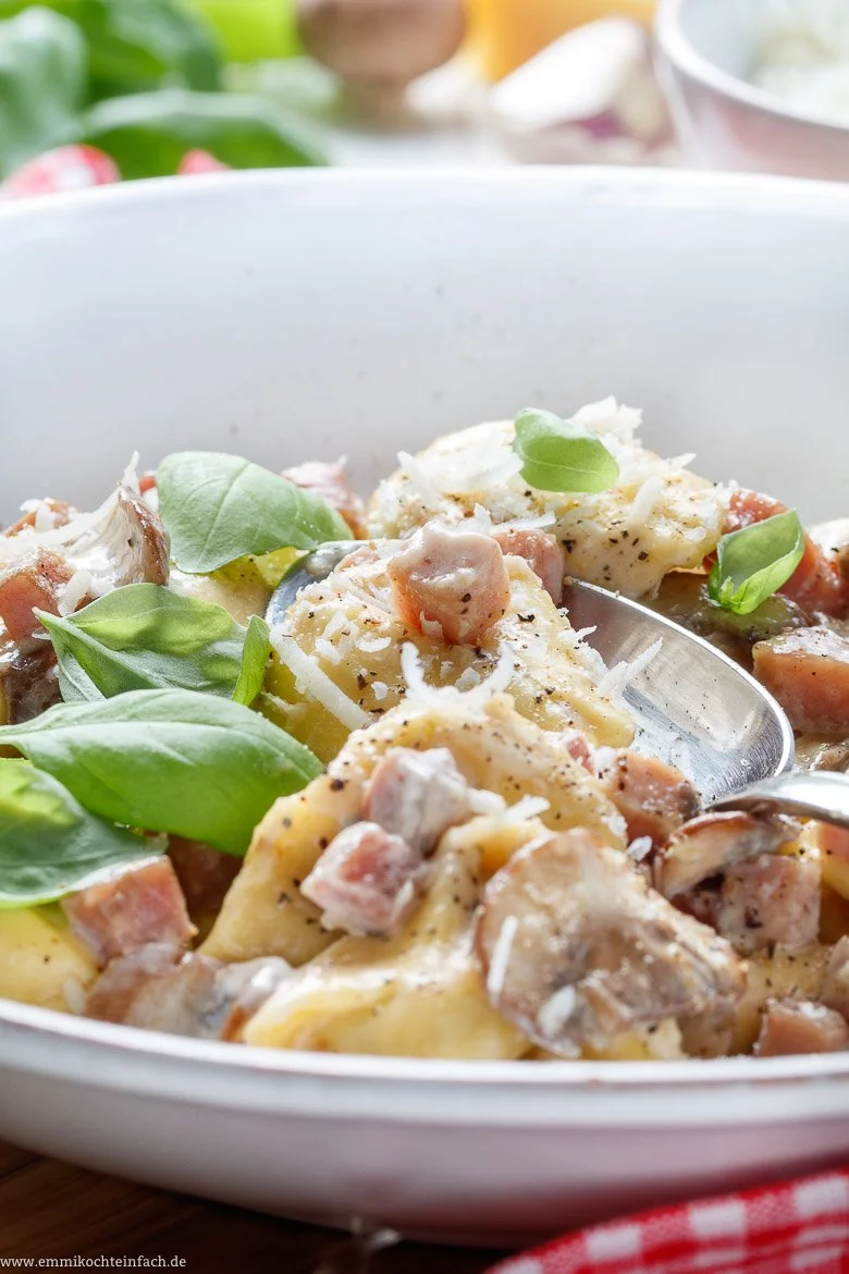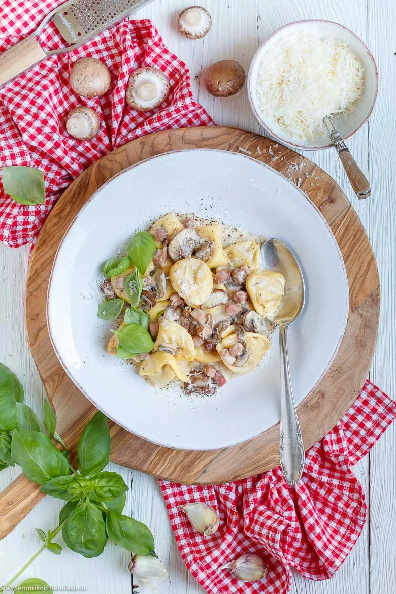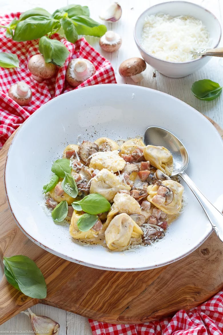 - Die Sahnesoße mit Schinken kannst du nach Belieben um dein Lieblingsgemüse ergänzen. Ich halte das Gericht am liebsten ganz einfach, mit Champignons als Gemüseeinlage. Bei der Tortellini-Füllung variiere ich hin und wieder einmal.