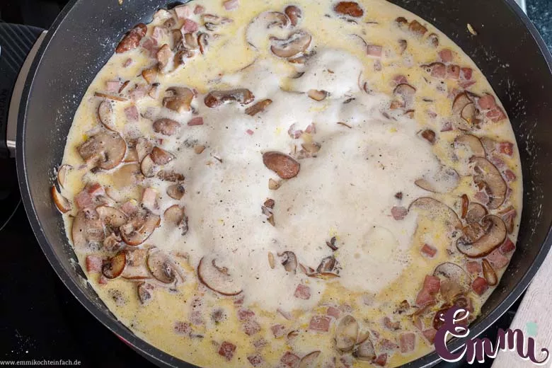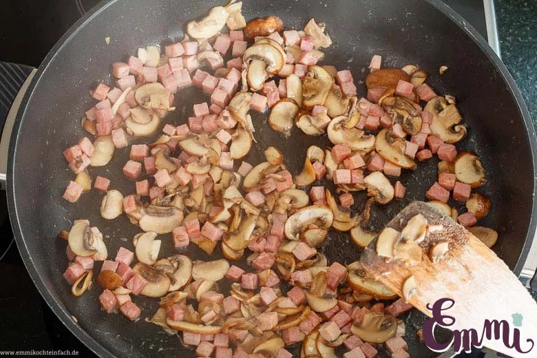 - Dann zerlässt du in einer beschichteten, großen Pfanne (hier habe ich eine mit 32 cm Durchmesser verwendet) die 50 g Butter und lässt darin die Schinkenwürfel und die Champignons für ca. 3 Minuten bei mittlerer bis hoher Stufe anrösten, bis sie leicht gebräunt sind.