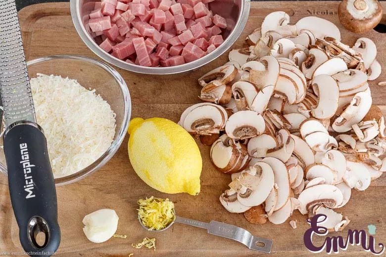 - Die 200 g gekochten Schinken schneidest du in Würfel. 150 g Champignons mit einer Pilzbürste putzen, die Stielenden entfernen und die Pilze in dünne Scheiben schneiden. Die 1 Knoblauchzehe schälst du und drückst sie mit dem Handballen oder einem Küchenutensil etwas platt und von der Bio-Zitrone reibst du dir etwa für 1 TL Schale ab. Die 30 g Parmesan reibst du fein.