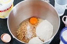 - Danach vermengst Du mit dem Teigrührer der Küchenmaschine/Handmixer oder den Händen die Croissant-Brösel mit dem Mehl, dem 1 TL Salz, dem Joghurt, Wasser und dem Ei.