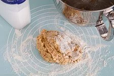 - Den Teig auf eine stark bemehlte Arbeitsfläche geben. Gegebenenfalls noch etwas Mehl hinein kneten, wenn er noch etwas zu klebrig/feucht ist. Wenn er zu trocken ist, einfach mit etwas Wasser sachte anreichern.