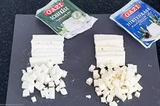- Den Schafkäse und den Hirtenkäse bröseln oder in Würfel schneiden.