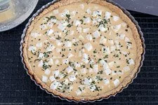- Jetzt wird die weiße Käse-Quiche für ca. 25 Minuten auf der mittleren Schiene im Ofen zu Ende gebacken. Ich wünsche Dir einen guten Appetit.