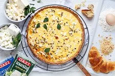 Die Krönung sind dann die beiden leckeren Käsevarianten von GAZi, der Schaf- und Hirtenkäse in Kombination. Der Hirtenkäse, hergestellt aus Kuhmilch, harmoniert mit seinem milden Geschmack ohnehin sehr gut mit dem Croissant-Boden. Dazu gesellt sich der aromatische Schafkäse ganz toll und beide liefern gemeinsam obendrein noch ein schönes Mundgefühl. Und schwupp war die weiße Käse-Quiche mit Schafkäse, Hirtenkäse und Croissant-Boden kreiert 🙂 .