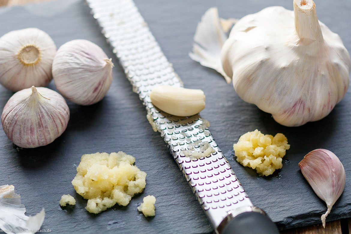 Du hast doch sicher auch eine Knoblauchpresse, oder? Mich persönlich nervt dieses Ding ja ungemein. Die Hälfte vom Knoblauch verteilt sich in den Ritzen und landet gar nicht in meinem Gericht. Dann muss ich das Teil auch noch umständlich säubern, weil sich der Knoblauch beim Ausdrücken überall hineingefressen hat. Zudem wird der Knoblauchgeschmack schärfer, wenn man ihn presst. Wenn ich den Knoblauch mit meiner Zester Reibe verarbeite, dann wird er herrlich fein, ich kann diese ruckzuck abspülen und fertig.