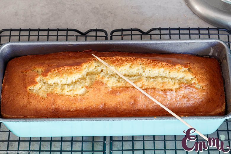 - Wenn der Zitronenkuchen fertig gebacken ist, stichst du mit dem Holzstäbchen einige Löcher in den heißen Kuchen und gießt den Zitronensaft einer halben Zitrone darüber. In der Kastenform ca. 10 Minuten ausdampfen lassen, bevor du ihn aus der Form herausholst.