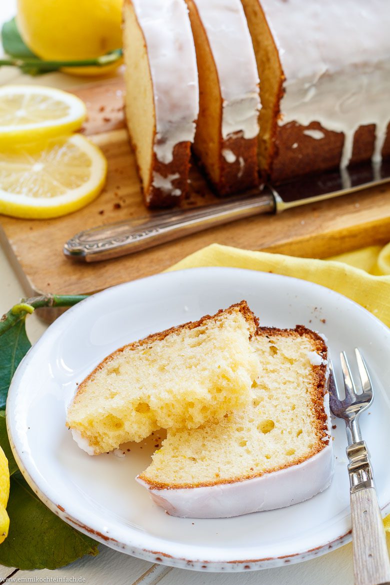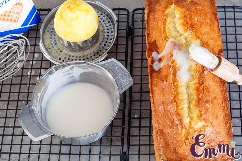 - Der Zitronensaft wird nicht direkt in den Kuchenteig gegeben. Den Saft einer halben Zitrone träufelst du über den heißen Kuchen, in feine, vorgestochene Löcher, nachdem du ihn in der Kastenform frisch aus dem Ofen geholt hast. Die andere Hälfte wird im Zuckerguss verarbeitet.