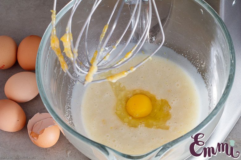 - Jetzt rührst du 5 zimmerwarme Eier, jeweils einzeln und nacheinander (jedes Ei für ca. 30 Sekunden) unter, damit sich Volumen in der Masse entwickelt und der Teig Luft bekommt.